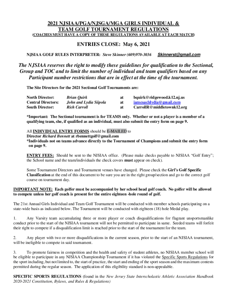 (COACHES MUST HAVE A COPY OF THESE REGULATIONS AVAILABLE AT EACH MATCH)ENTRIES CLOSE: May 6, 2021,