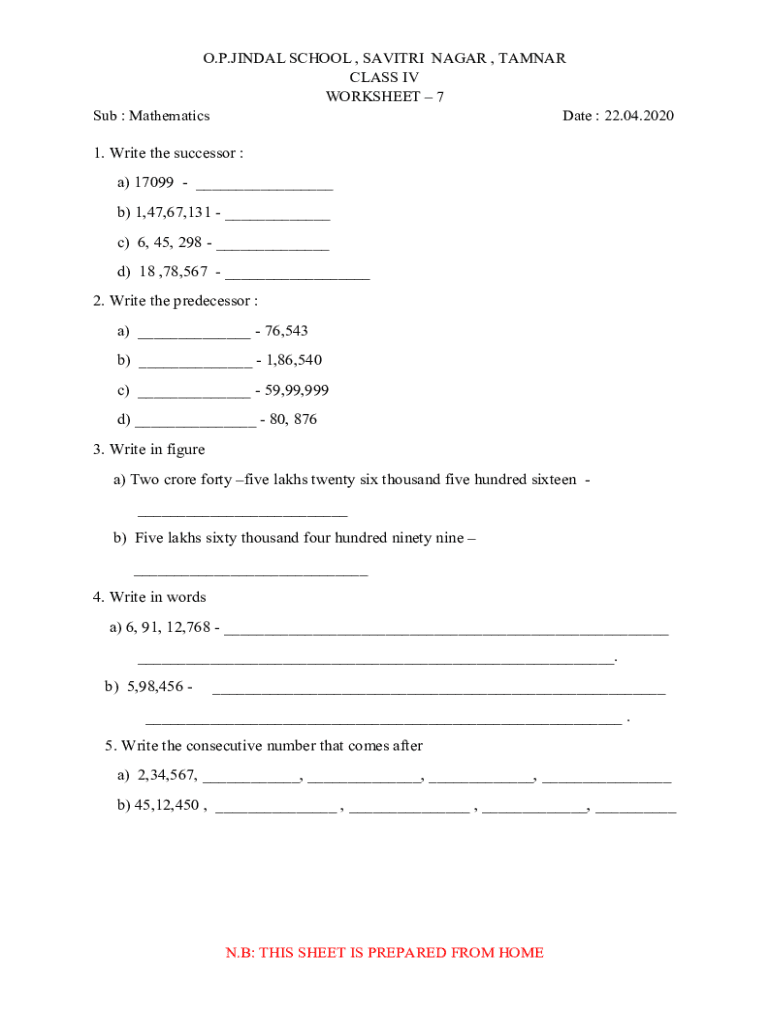 O.P.FINAL SCHOOL, SAVITṚ NAGAR, TAMAR CLASS IV WORKSHEET 7 Sub : Mathematics Date : 22.04.20201. Write the successor : a) 17099 ___ b) 1,47,67,131 ___ c) 6, 45, 298 ___ d) 18, 78,567 ___ 2. Write