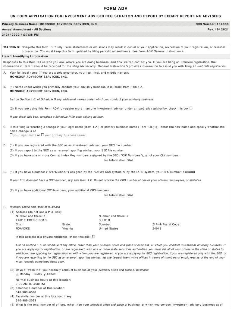 Get the free Primary Business Name: MONSOUR ADVISORY SERVICES, INC