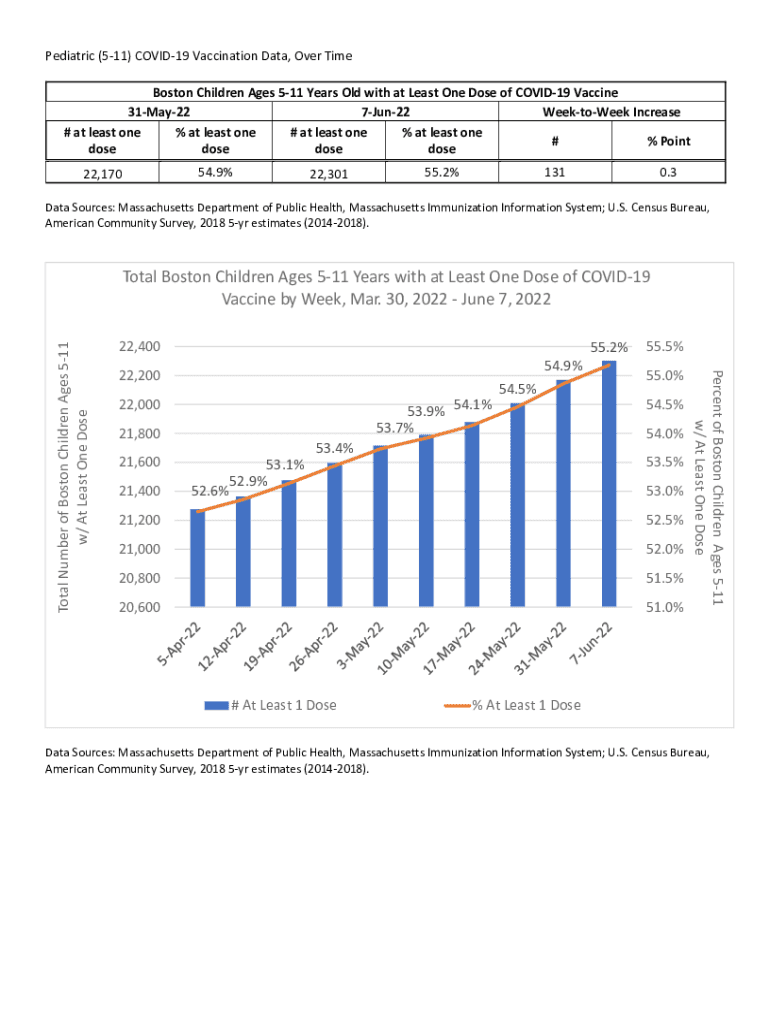 Pediatric(511)COVID19VaccinationData,Overtime BostonChildrenAges511YearsOldwithatLeastOneDoseofCOVID19Vaccine 31May22 7Jun22 WeektoWeekIncrease #milestone %atleastone #milestone %atleastone # point