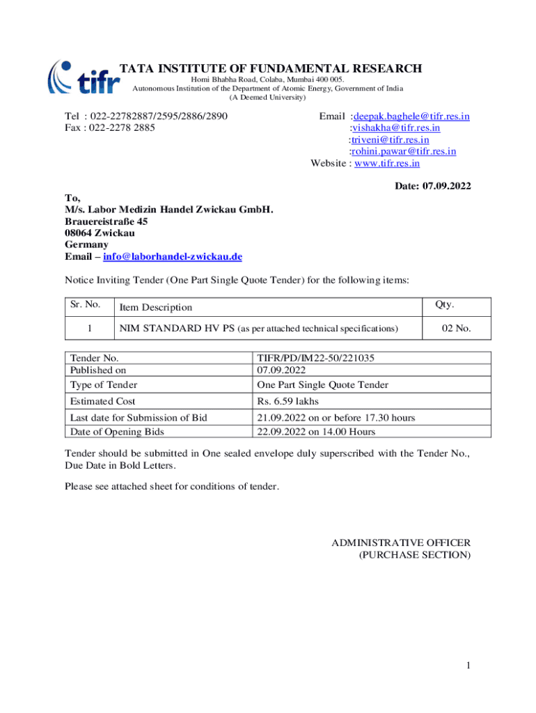 TATA INSTITUTE OF FUNDAMENTAL RESEARCH Home Baha Road, Clara, Mumbai 400 005. Autonomous Institution of the Department of Atomic Energy, Government of India (A Deemed University)Tel : 02222782887/2595/2886/2890