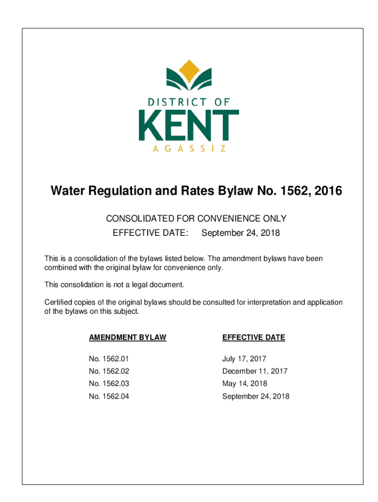 Water Regulation and Rates Bylaw No. 1562, 2016 CONSOLIDATED FOR CONVENIENCE ONLY EFFECTIVE DATE:September 24, 2018This is a consolidation of the bylaws listed below. The amendment bylaws have been