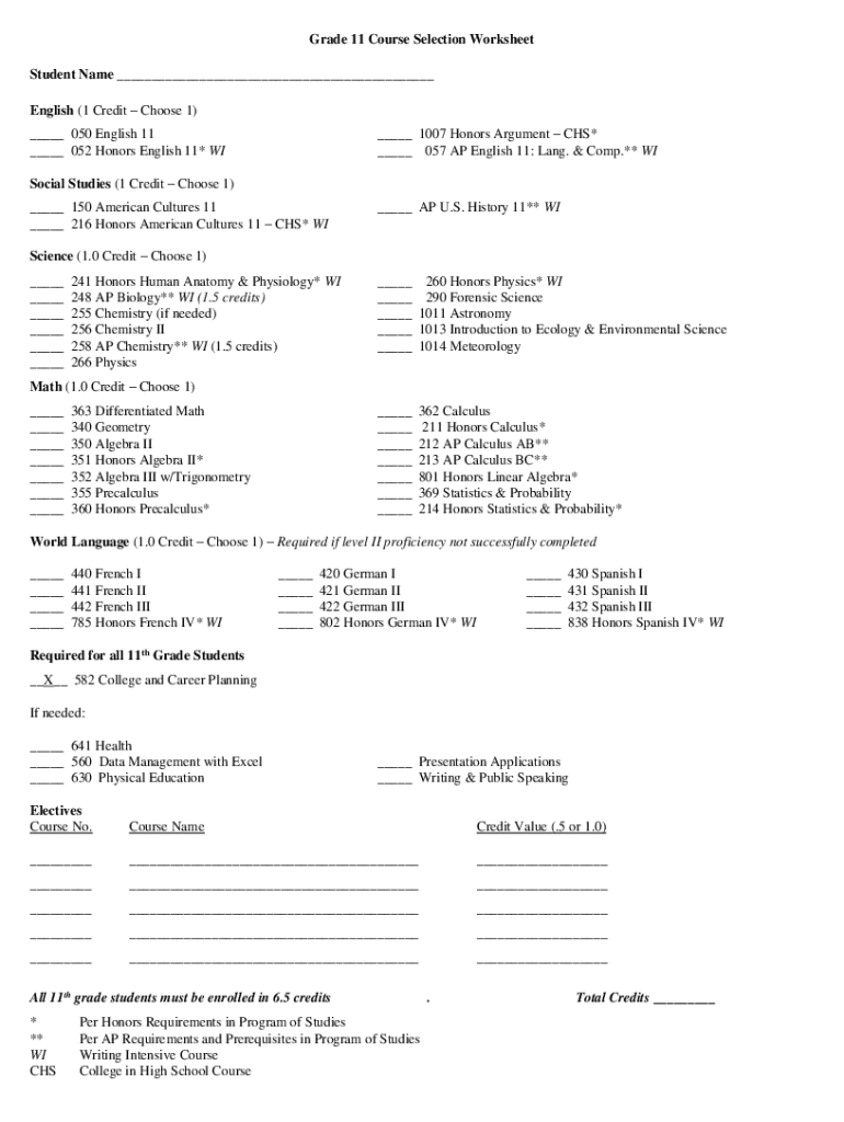 Grade 11 Course Selection Worksheet Student Name ___ English (1 Credit Choose 1) ___ 1007 Honors Argument CHS* ___ 057 AP English 11: Lang. & Comp.** WI___ 050 English 11 ___ 052 Honors English 11*