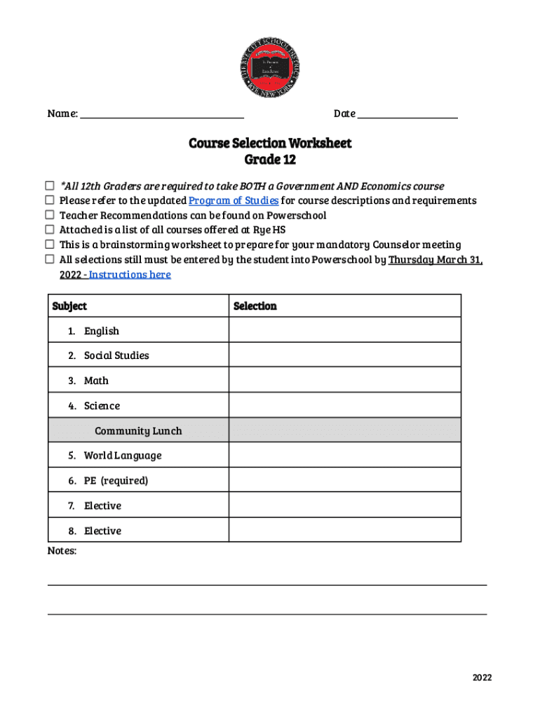 Name: ___Date ___Course Selection Worksheet Grade 12 *All 12th Graders are required to take BOTH a Government AND Economics course Please refer to the updated Program of Studies for course descriptions