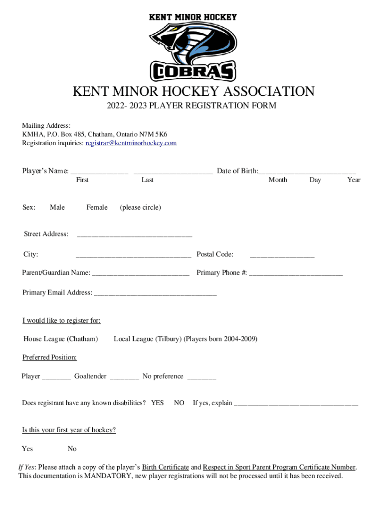 KENT MINOR HOCKEY ASSOCIATION 2022 2023 PLAYER REGISTRATION FORM Mailing Address: YMHA, P.O. Box 485, Chatham, Ontario N7M 5K6 Registration inquiries: registrar@kentminorhockey.comPlayers Name: ___