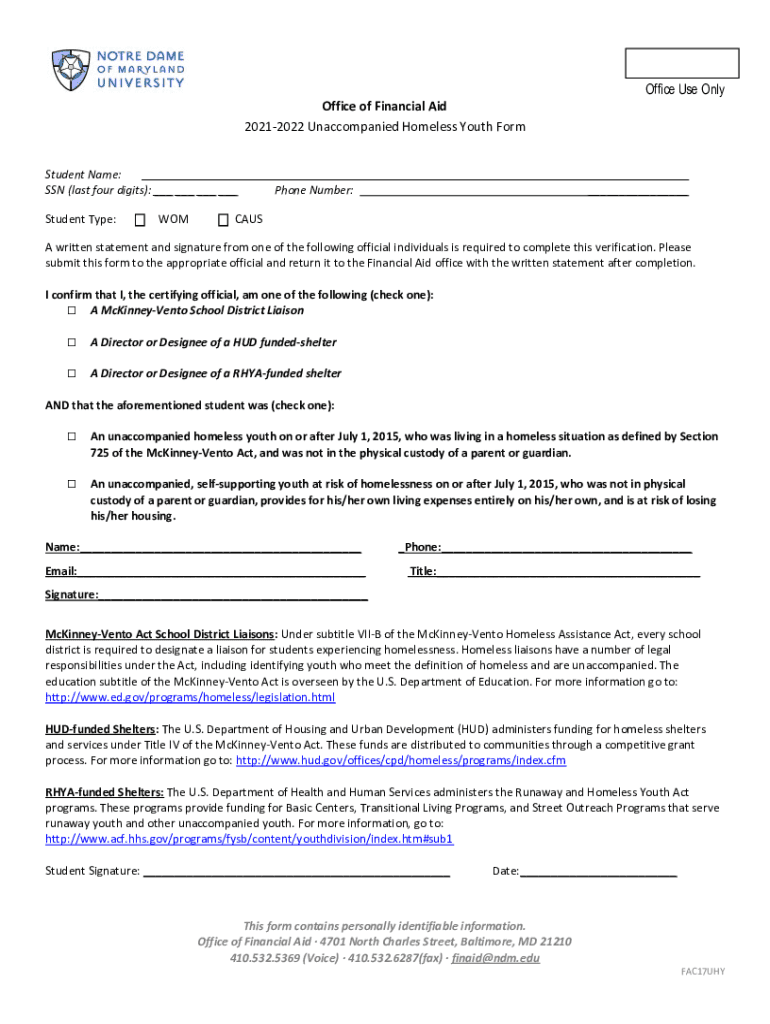 Office Use Only Office of Financial Aid 20212022 Unaccompanied Homeless Youth Form Student Name: SSN (last four digits): ___ ___ ___ ___ Student Type:WON___ ___Phone Number:CAUSE written statement
