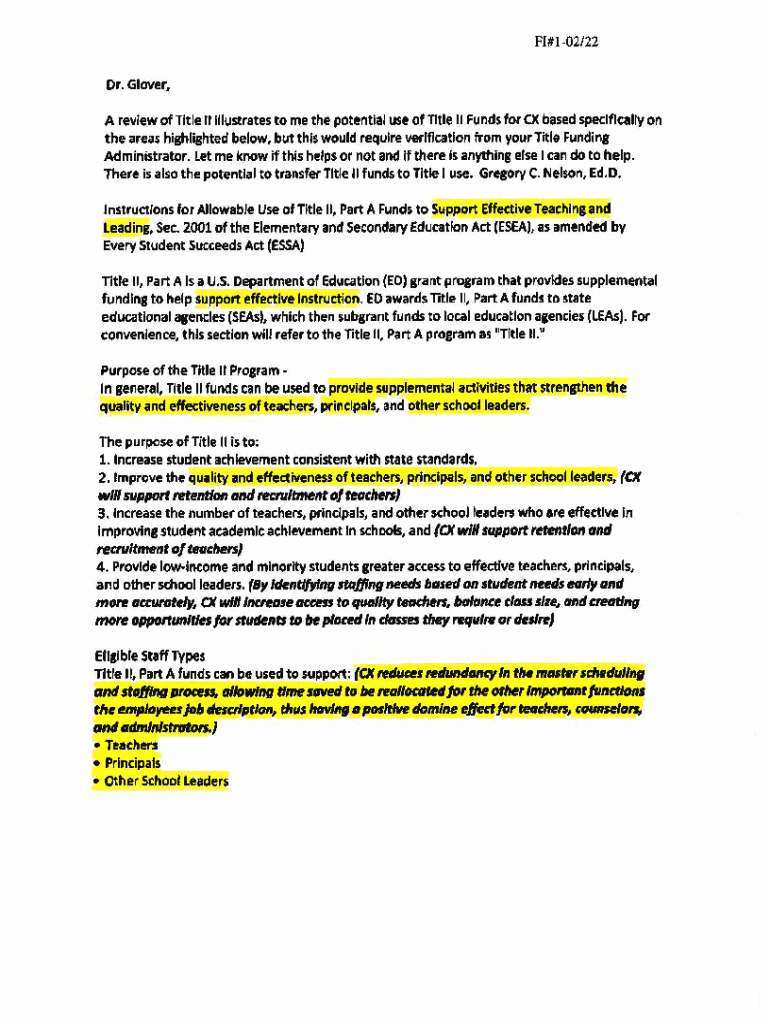 Fl#l02/22 Or. Glover, A review of Title II Illustrates to me the potential use of Title II Funds for CX based specifically on the areas highlighted below, but this would require verification from