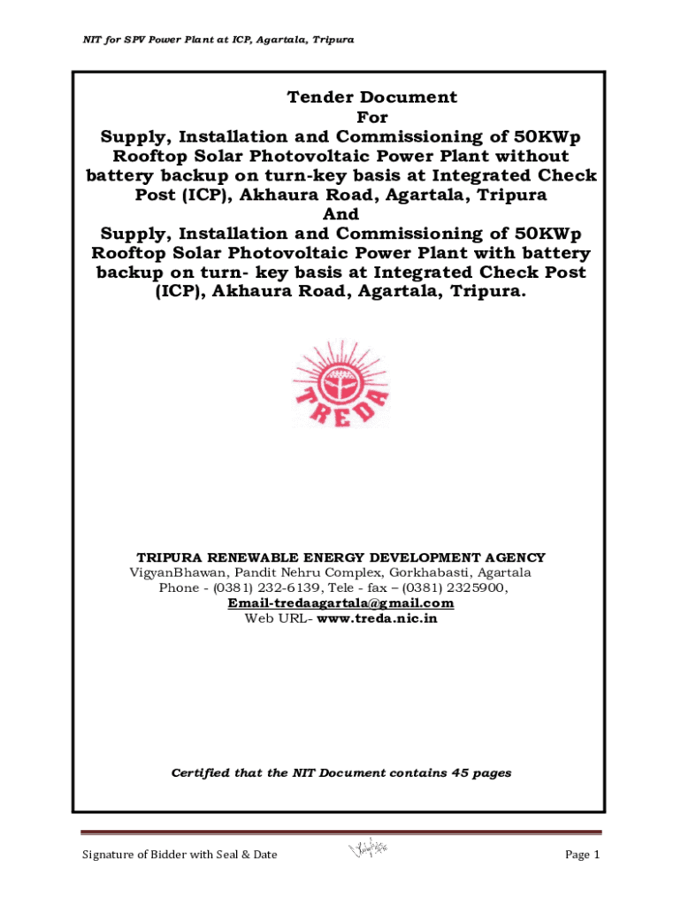 NIT for SPV Power Plant at ICP, Agartala, TripuraTender Document For Supply, Installation and Commissioning of 50KWp Rooftop Solar Photovoltaic Power Plant without battery backup on turnkey basis