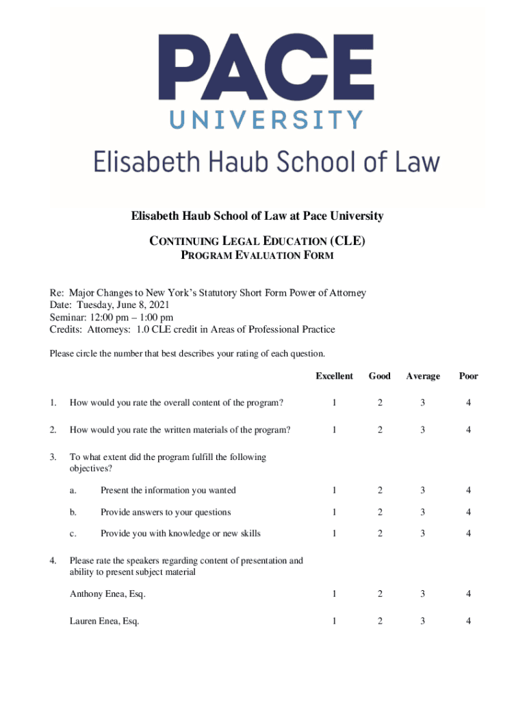 Elisabeth Hub School of Law at Pace UniversityCONTINUING LEGAL EDUCATION (CLE) PROGRAM EVALUATION FORM Re: Major Changes to New York's Statutory Short Form Power of Attorney Date: Tuesday, June 8,