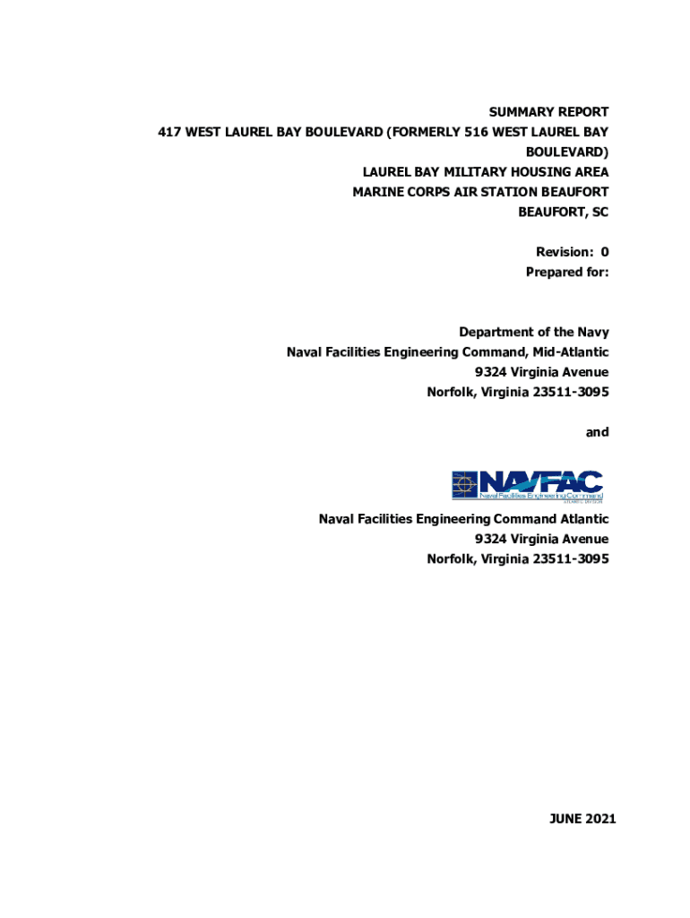 SUMMARY REPORT 417 WEST LAUREL BAY BOULEVARD (FORMERLY 516 WEST LAUREL BAY BOULEVARD) LAUREL BAY MILITARY HOUSING AREA MARINE CORPS AIR STATION BEAUFORT, SC Revision: 0 Prepared for:Department of