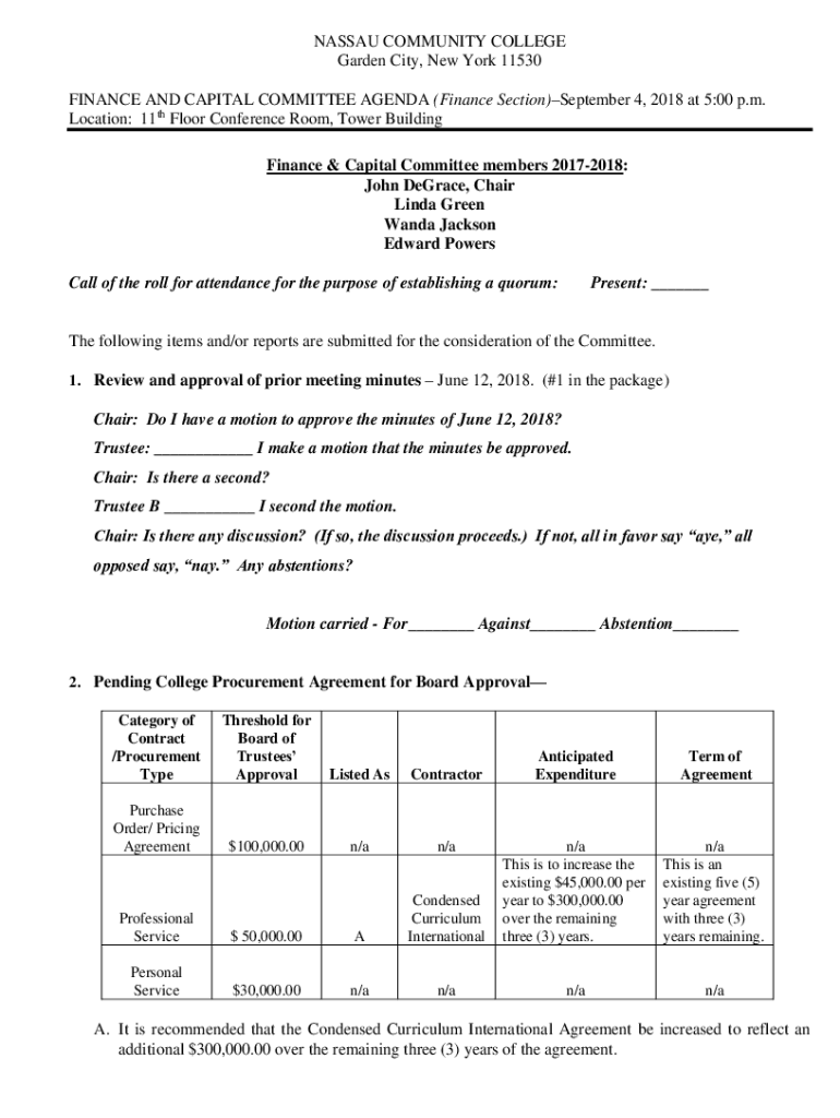 NASSAU COMMUNITY COLLEGE Garden City, New York 11530 FINANCE AND CAPITAL COMMITTEE AGENDA (Finance Section)September 4, 2018, at 5:00 p.m. Location: 11th Floor Conference Room, Tower Building Finance