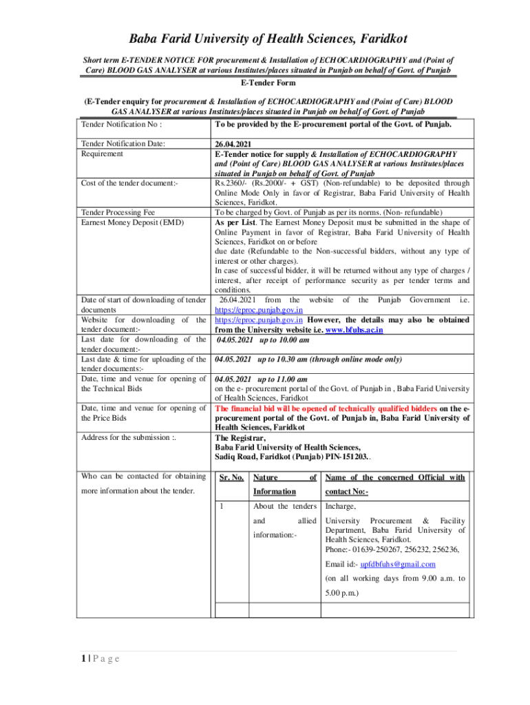 Baba Farid University of Health Sciences, Haricot Short term TENDER NOTICE FOR procurement & Installation of ECHOCARDIOGRAPHY and (Point of Care) BLOOD GAS Analyzer at various Institutes/places situated