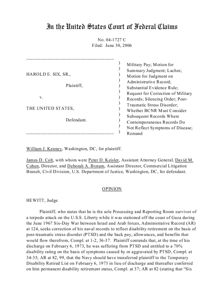 In the United States Court of Federal Claims No. 041727 C Filed: June 30, 2006 ___HAROLD E. SIX, SR., Plaintiff, v. THE UNITED STATES, Defendant. ___)))))))))))))Military Pay; Motion for Summary Judgment;