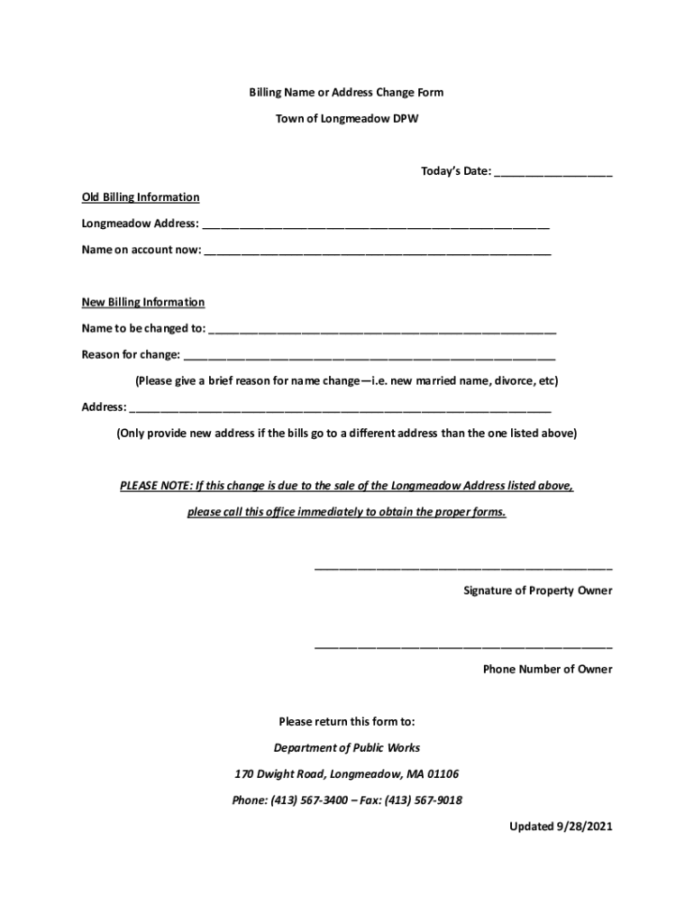 Billing Name or Address Change Form Town of Long meadow DPWTodays Date: ___ Old Billing Information Long meadow Address: ___ Name on account now: ___New Billing Information Name to be changed to: