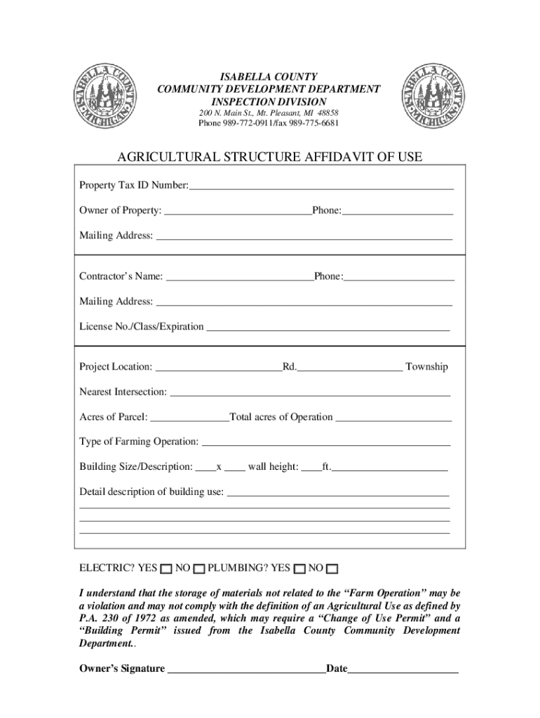 ISABELLA COUNTY COMMUNITY DEVELOPMENT DEPARTMENT INSPECTION DIVISION 200 N. Main St., Mt. Pleasant, MI 48858Phone 9897720911/fax 9897756681AGRICULTURAL STRUCTURE AFFIDAVIT OF USE Property Tax ID Number:___