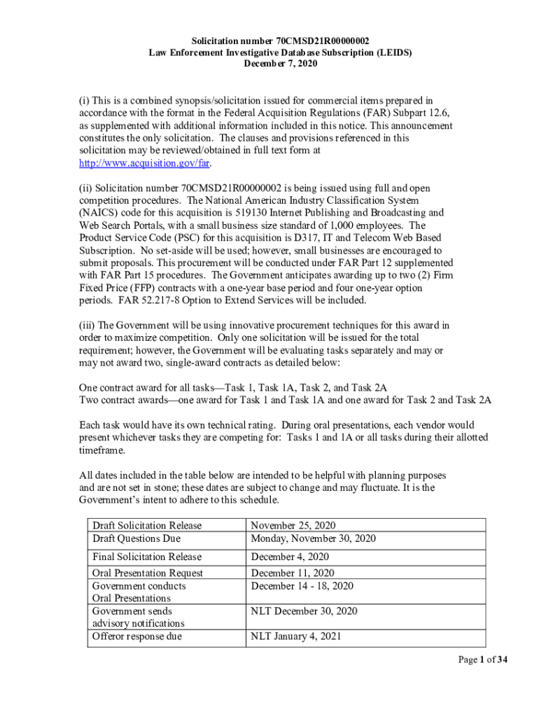 Solicitation number 70CMSD21R00000002 Law Enforcement Investigative Database Subscription (LEADS) December 7, 2020(i) This is a combined synopsis/solicitation issued for commercial items prepared