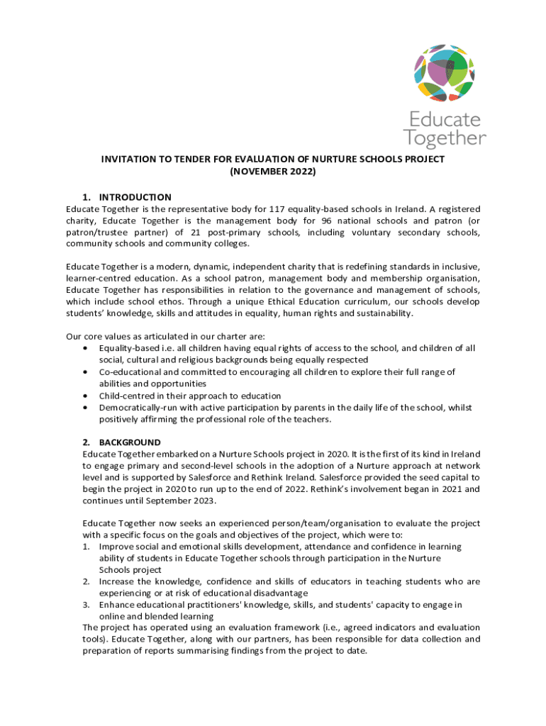 INVITATION TO TENDER FOR EVALUATION OF NURTURE SCHOOLS PROJECT (NOVEMBER 2022) 1. INTRODUCTIONEducate Together is the representative body for 117 equality based schools in Ireland. A registered charity,
