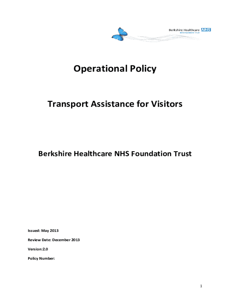 Operational PolicyTransport Assistance for Visitors Berkshire Healthcare NHS Foundation TrustIssued: May 2013 Review Date: December 2013 Version:2.0 Policy Number:1Title of Policy: Transport Assistance