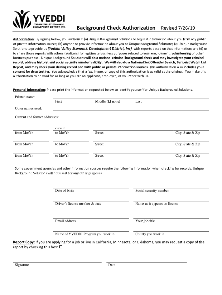 Get the free Background Check AuthorizationRevised 7/26/19YVEDDI.com