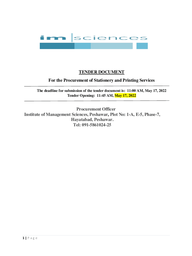 TENDER DOCUMENT For the Procurement of Stationery and Printing Services The deadline for submission of the tender document is: 11:00 AM, May 17, 2022, Tender Opening: 11:45 AM, May 17, 2022Procurement