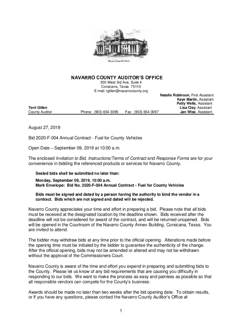 NAVARRO COUNTY AUDITORS OFFICE 300 West 3rd Ave, Suite 4 Corsican, Texas 75110 Email: tgillen@navarrocounty.orgTerri Gilles County Auditor Natalie Robinson, First Assistant Kaye Martin, Assistant