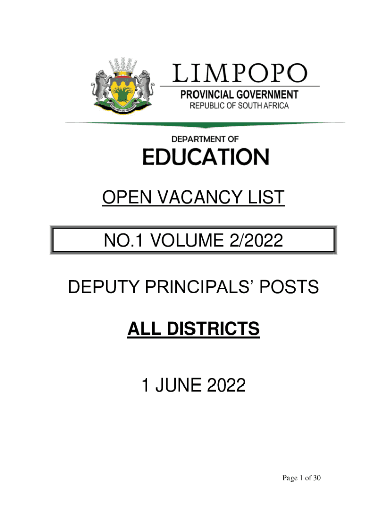 OPEN VACANCY LIST NO.1 VOLUME 2/2022 DEPUTY PRINCIPALS POSTS ALL DISTRICTS 1 JUNE 2022Page 1 of 30Page 2 of 301. PREFACE: 1.1. This is an open vacancy list No. 1 Volume 2/ 2022 dated 1st June 2022,