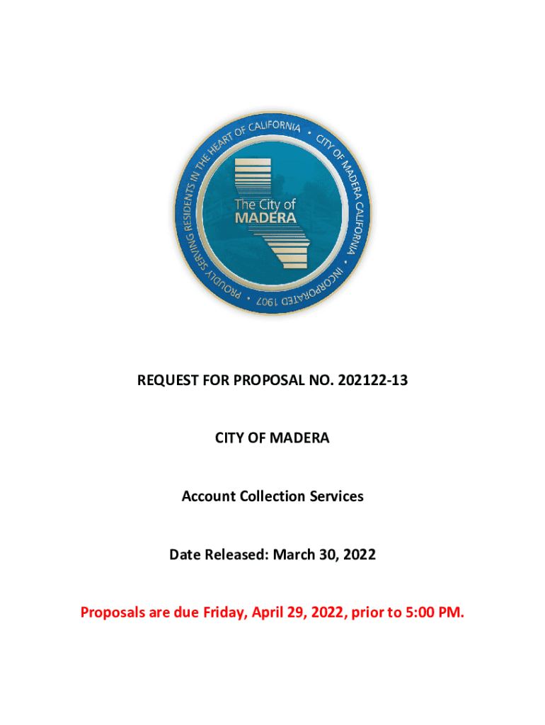 REQUEST FOR PROPOSAL NO. 20212213 CITY OF MADERA Account Collection Services Date Released: March 30, 2022, Proposals are due Friday, April 29, 2022, prior to 5:00 PM.TABLE OF CONTENTS I.BACKGROUND
