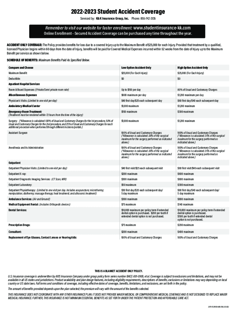20222023 Student Accident Coverage Serviced by: K&K Insurance Group, Inc. Phone: 8557423135Remember to visit our website for faster enrollment: www.studentinsurancekk.comOnline EnrollmentSecured Accident