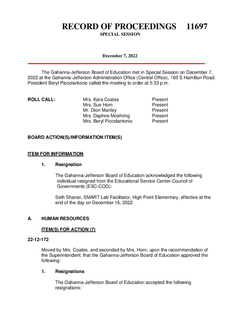 RECORD OF PROCEEDINGS11697SPECIAL SESSION December 7, 2022The GahannaJefferson Board of Education met in Special Session on December 7,