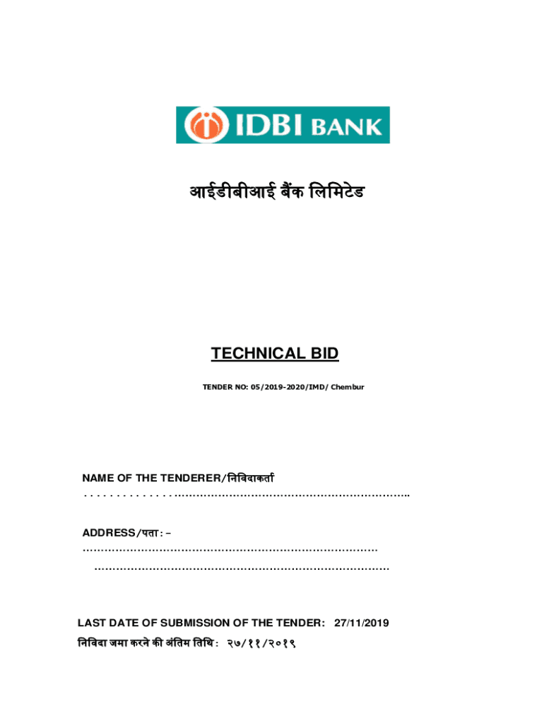TECHNICAL BID TENDER NO: 05/20192020/IMD/ ChemburNAME OF THE TENDERER/ ................ADDRESS/: LAST DATE OF SUBMISSION OF THE TENDER: 27/11/2019