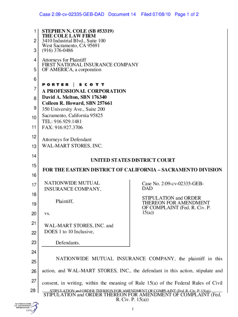 Case 2:09cv02335GEBDAD Document 141 2 3 4 5Filed 07/08/10-Page 1 of 2STEPHEN N. COLE (SB #53319) THE COLE LAW FIRM 3410 Industrial Blvd., Suite 100 West Sacramento, CA 95691 (916) 3760486 Attorneys