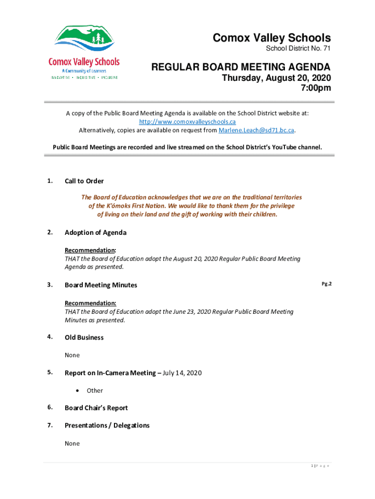 Como Valley Schools School District No. 71REGULAR BOARD MEETING AGENDA Thursday, August 20, 2020 7:00pm A copy of the Public Board Meeting Agenda is available on the School District website at: http://www.comoxvalleyschools.ca