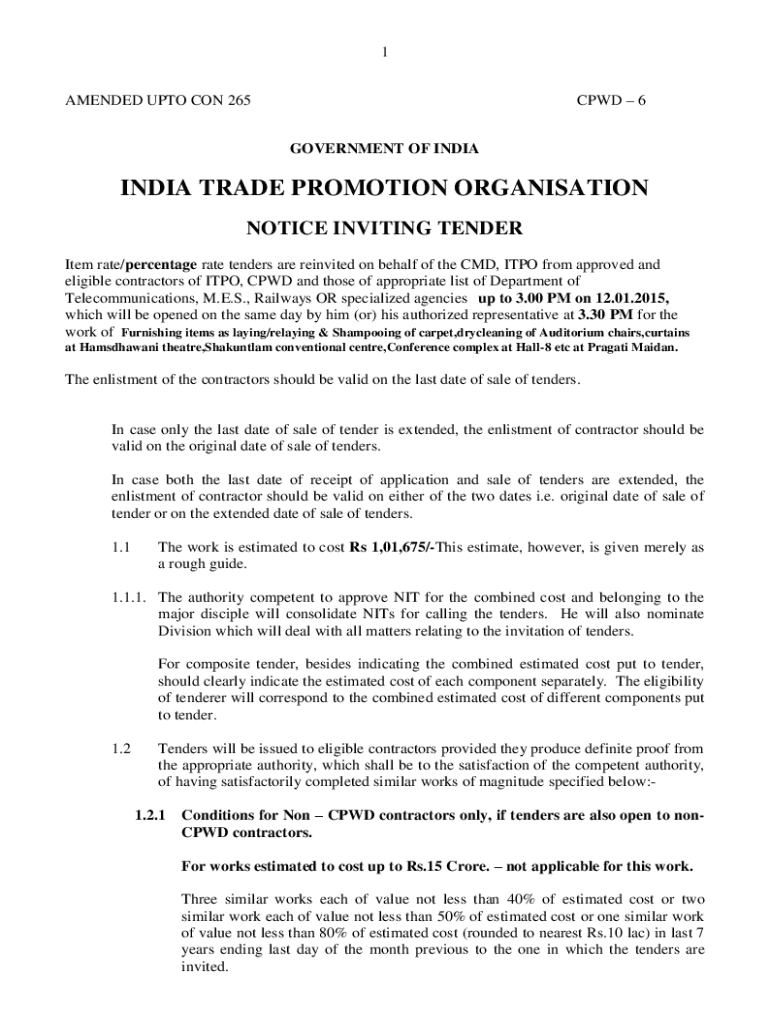 1 CPD 6AMENDED UNTO CON 265 GOVERNMENT OF INDIA TRADE PROMOTION Organization NOTICE INVITING TENDER Item rate/percentage rate tenders are reinvited on behalf of the CMD, IPO from approved and eligible