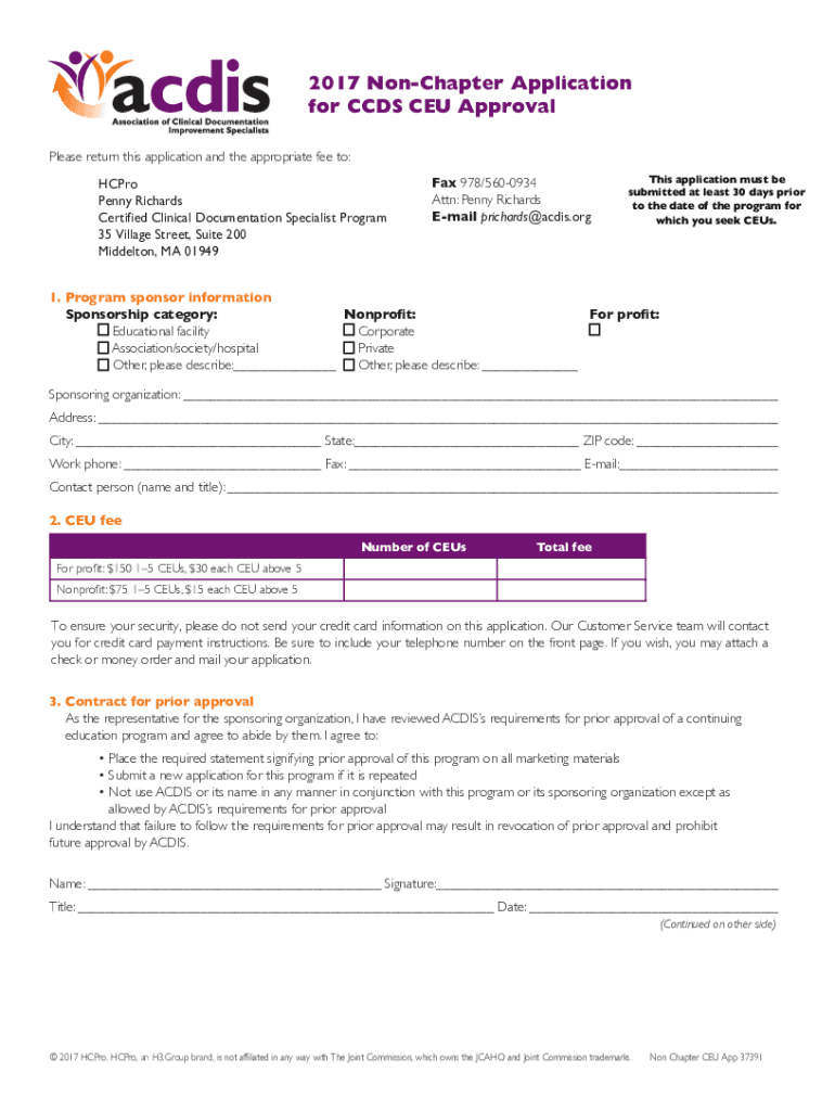 2017 Chapter Application for CDs CEU Approval Please return this application and the appropriate fee to: Pro Penny Richards Certified Clinical Documentation Specialist Program 35 Village Street, Suite