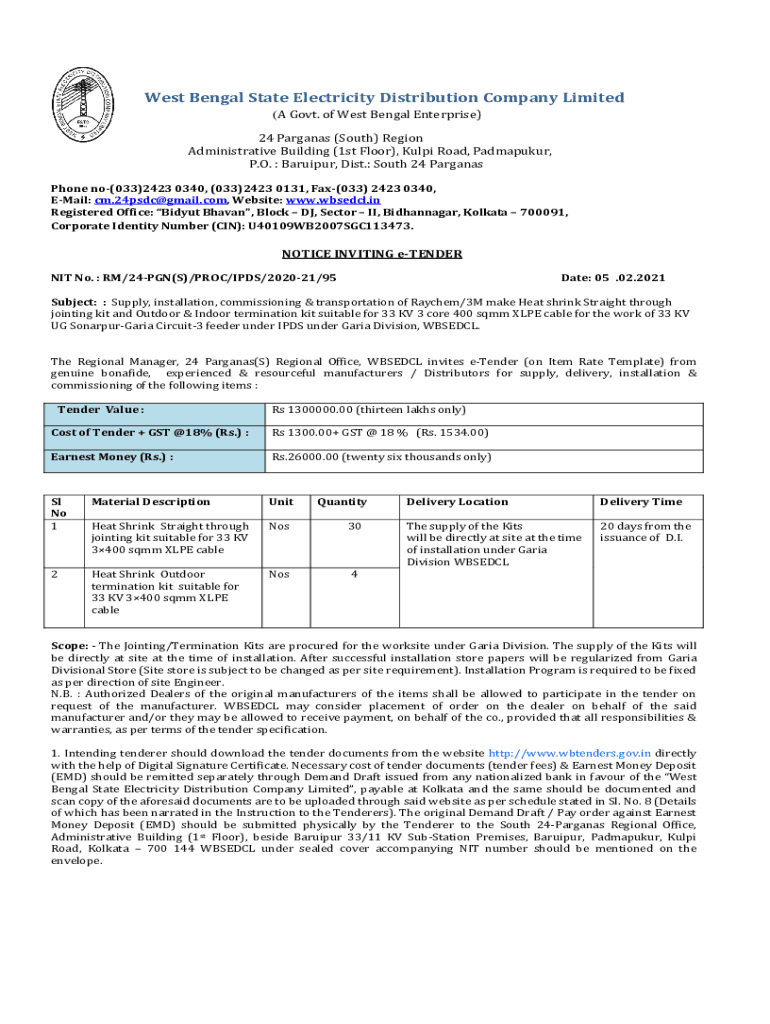 West Bengal State Electricity Distribution Company Limited (A Govt. of West Bengal Enterprise) 24 Marianas (South) Region Administrative Building (1st Floor), Multi Road, Padmapukur, P.O. : Barrier,