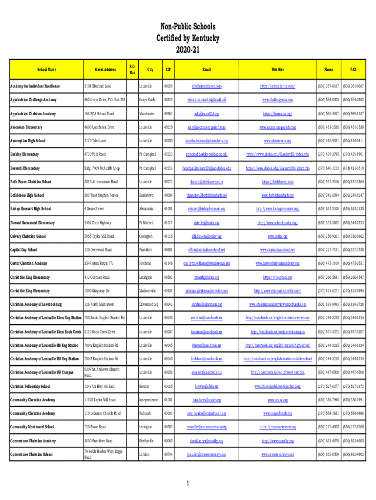 Nonpublic Schools Certified by Kentucky 202021 School Backstreet Address. O. BoxCityZIPEmailWeb SitePhoneFAXAcademy for Individual Excellence3101 Bluebird LaneLouisville40299info@aiexcellence.comhttps://aiexcellence.com/(502)
