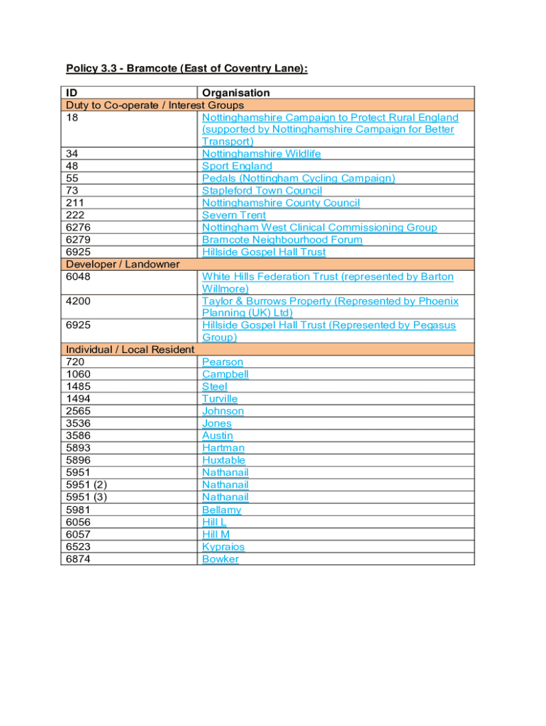 Policy 3.3 Promote (East of Coventry Lane): ID Organization Duty to Cooperate / Interest Groups 18 Nottingham shire Campaign to Protect Rural England (supported by Nottingham shire Campaign for Better