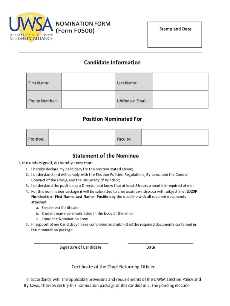 Candidate Information First Name:Last Name:Phone Number:Windsor Email:Position Nominated For Position:Faculty:Statement of the Nominee, the undersigned, do hereby state that:1. I hereby declare my