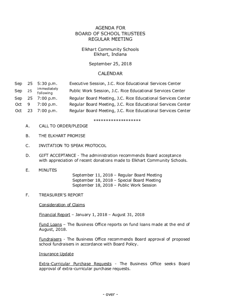 AGENDA FOR BOARD OF SCHOOL TRUSTEES REGULAR MEETING Elkhart Community Schools Elkhart, Indiana September 25, 2018CALENDAR Sep255:30 p.m. Executive Session, J.C. Rice Educational Services CenterSep25immediately