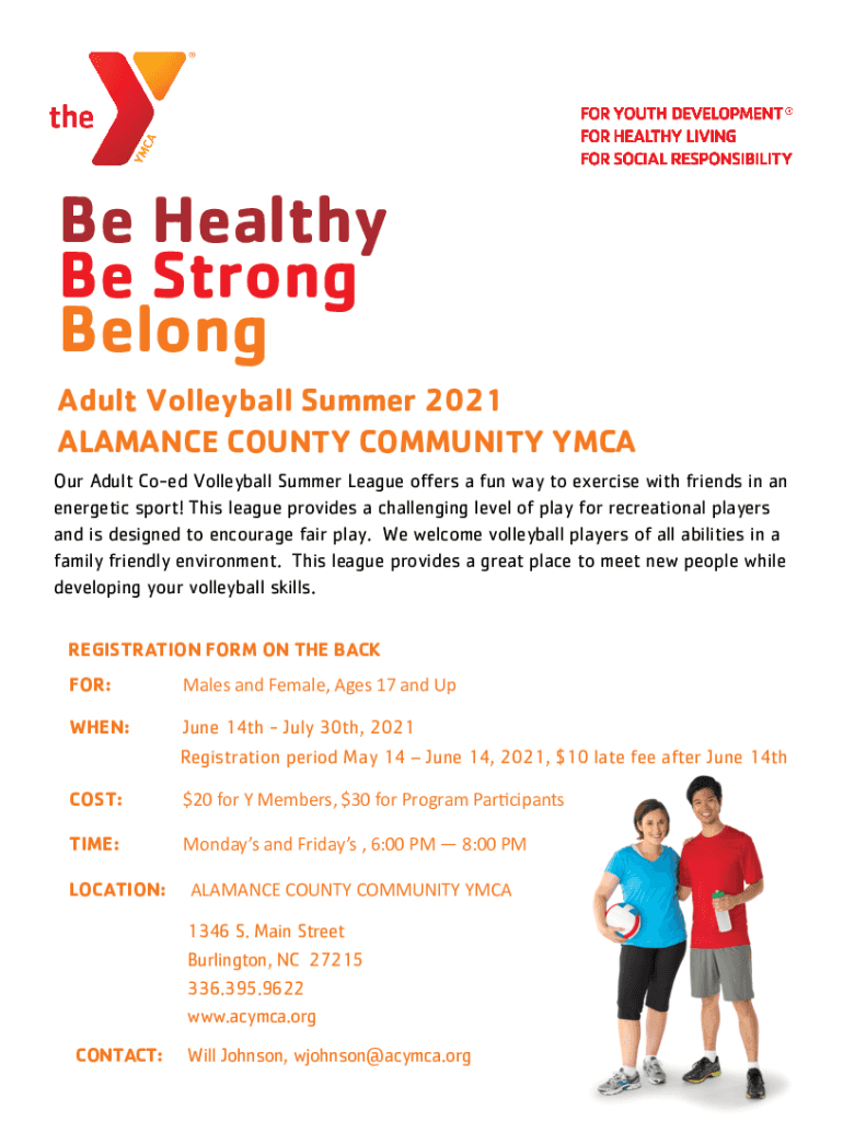 Be Healthy Be Strong Belong Adult Volleyball Summer 2021 ALLIANCE COUNTY COMMUNITY YMCA Our Adult Coed Volleyball Summer League offers a fun way to exercise with friends in an energetic sport! This