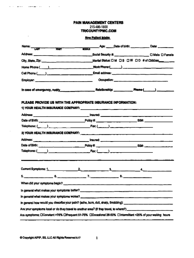 PAIN MANAGEMENT CENTERS 2154861800TRICOUNTYPMC.COM New Path;NT NOW Name: ___:::::Age: _Data of birth: __ __ Date: ___ ll1DDLE I. Address: ___Social Security#: ___City, State, Zip: ___Marital Status’M