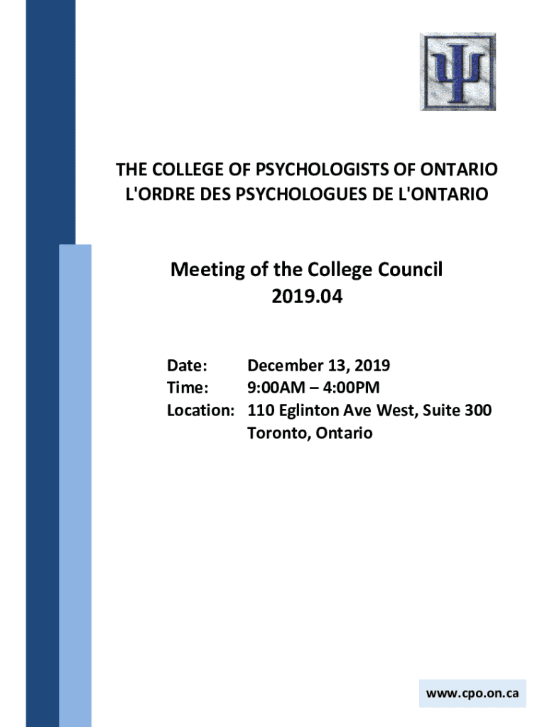 THE COLLEGE OF PSYCHOLOGISTS OF ONTARIO L\'ORDURE DES PSYCHOLOGIES DE L\'ONTARIOMeeting of the College Council 2019.04 Date: December 13, 2019, Time: 9:00AM 4:00PM Location: 110 Clinton Ave West,