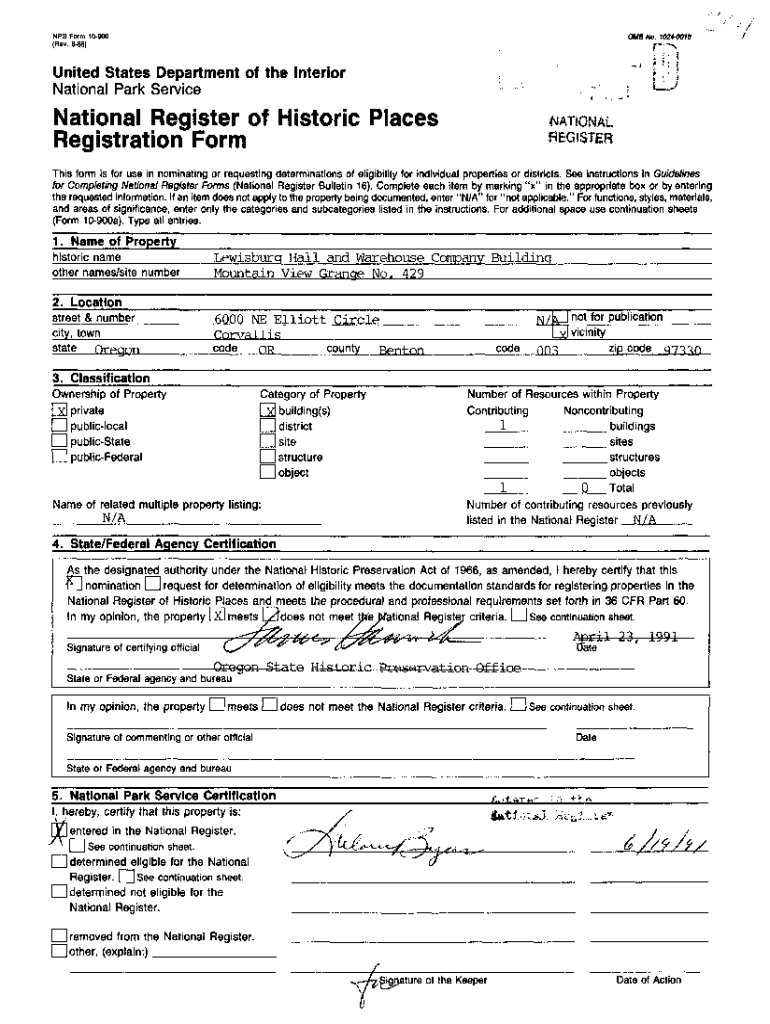 The form requires information such as the property's name, location, description, historical significance, period of significance, and contributing and non-contributing resources.