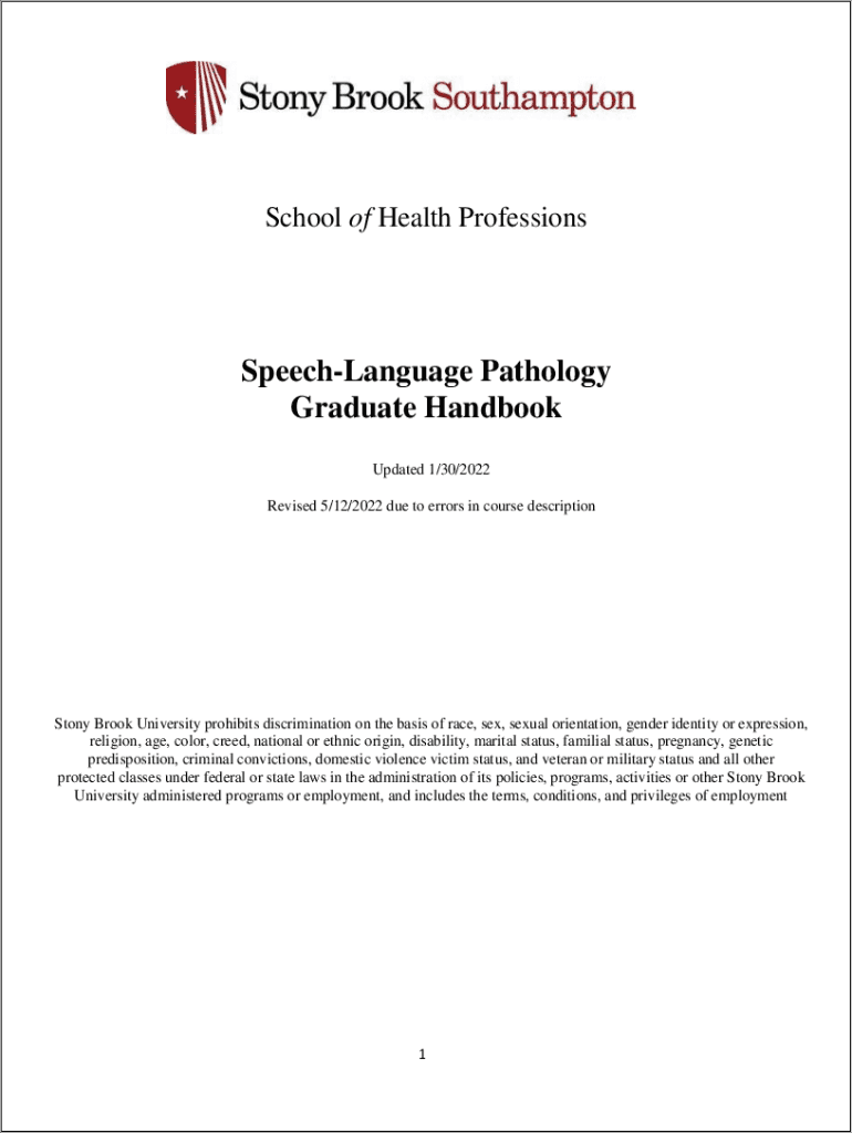 School of Health ProfessionsSpeechLanguage Pathology Graduate from Handbook Updated 1/30/2022 Revised 5/12/2022 due to errors in course descriptionStony Brook University prohibits discrimination on