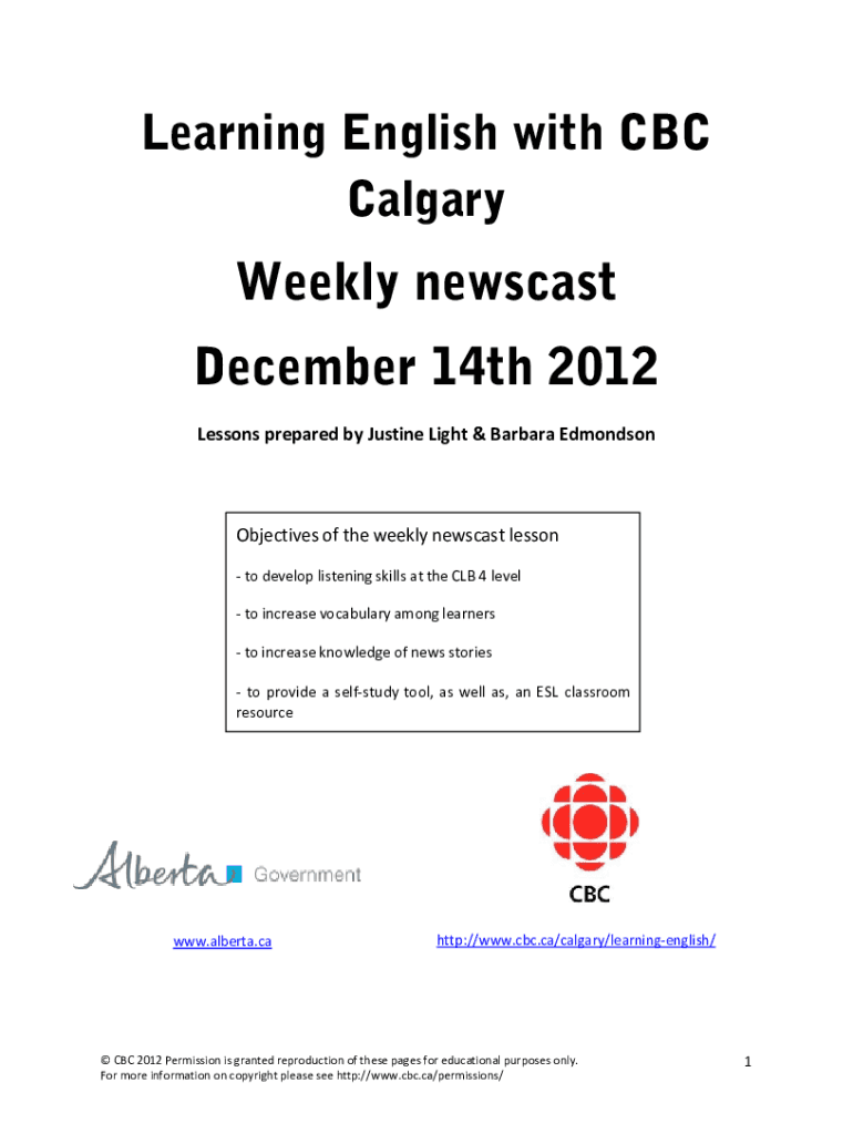 Learning English with CBC CalgaryWeekly newscast December 14th 2012 Lessons prepared by Justine Light & Barbara EdmondsonObjectives of the weekly newscast lesson to develop listening skills at the