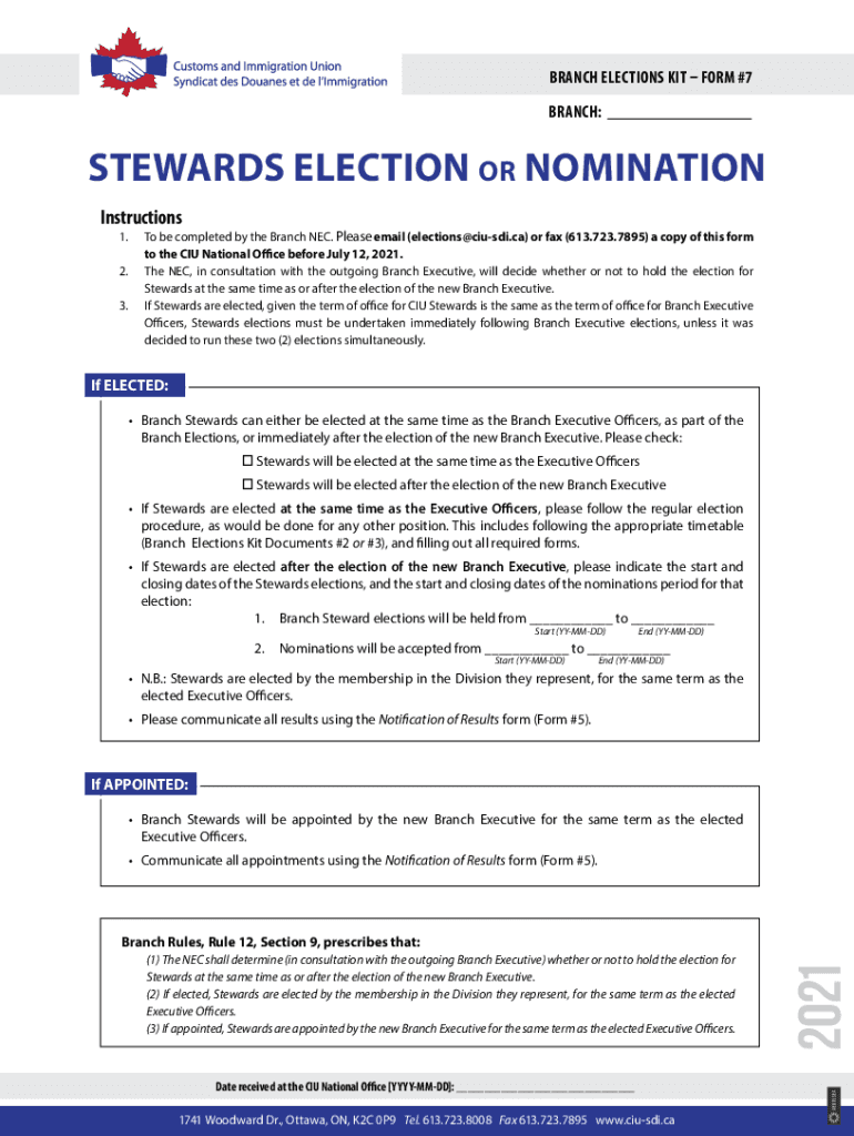 BRANCH ELECTIONS KIT FORM #7 BRANCH:STEWARDS ELECTION OR NOMINATION Instructions 1.2.3. To be completed by the Branch NEC. Please email (elections@ciusdi.ca) or fax (613.723.7895) a copy of this form