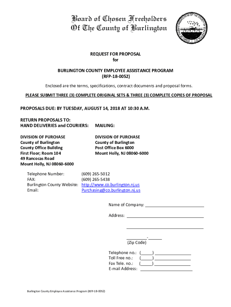 Board of Chosen Freeholders Of The County of Burlington REQUEST FOR PROPOSAL for BURLINGTON COUNTY EMPLOYEE ASSISTANCE PROGRAM (RFP180052) Enclosed are the terms, specifications, contract documents