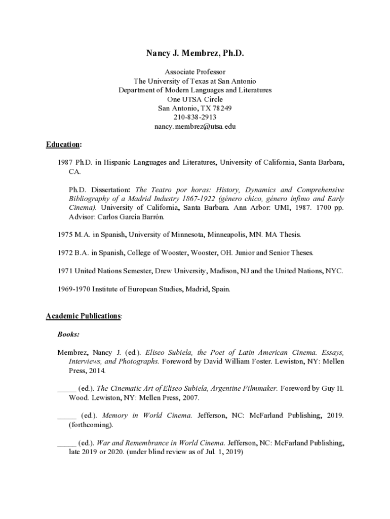 Nancy J. Member, Ph.D. Associate Professor The University of Texas at San Antonio Department of Modern Languages and Literatures One UTSA Circle San Antonio, TX 78249 2108382913 nancy.membrez@utsa.edu
