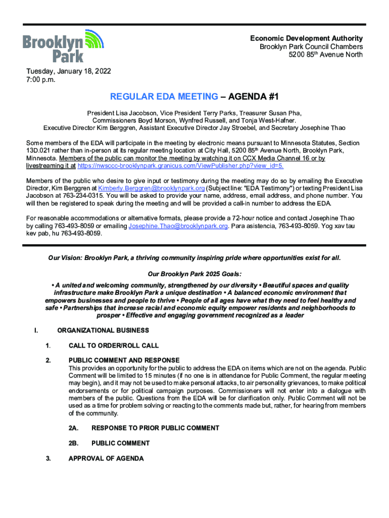 Economic Development Authority Brooklyn Park Council Chambers 5200 85th Avenue North Tuesday, January 18, 2022 7:00 p.m.REGULAR EDA MEETING AGENDA #1 President Lisa Jacobson, Vice President Terry