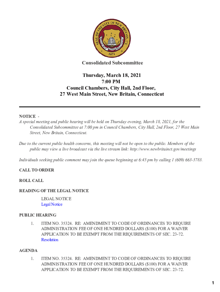 Consolidated Subcommittee Thursday, March 18, 2021 7:00 PM Council Chambers, City Hall, 2nd Floor, 27 West Main Street, New Britain, ConnecticutNOTICE A special meeting and public hearing will be